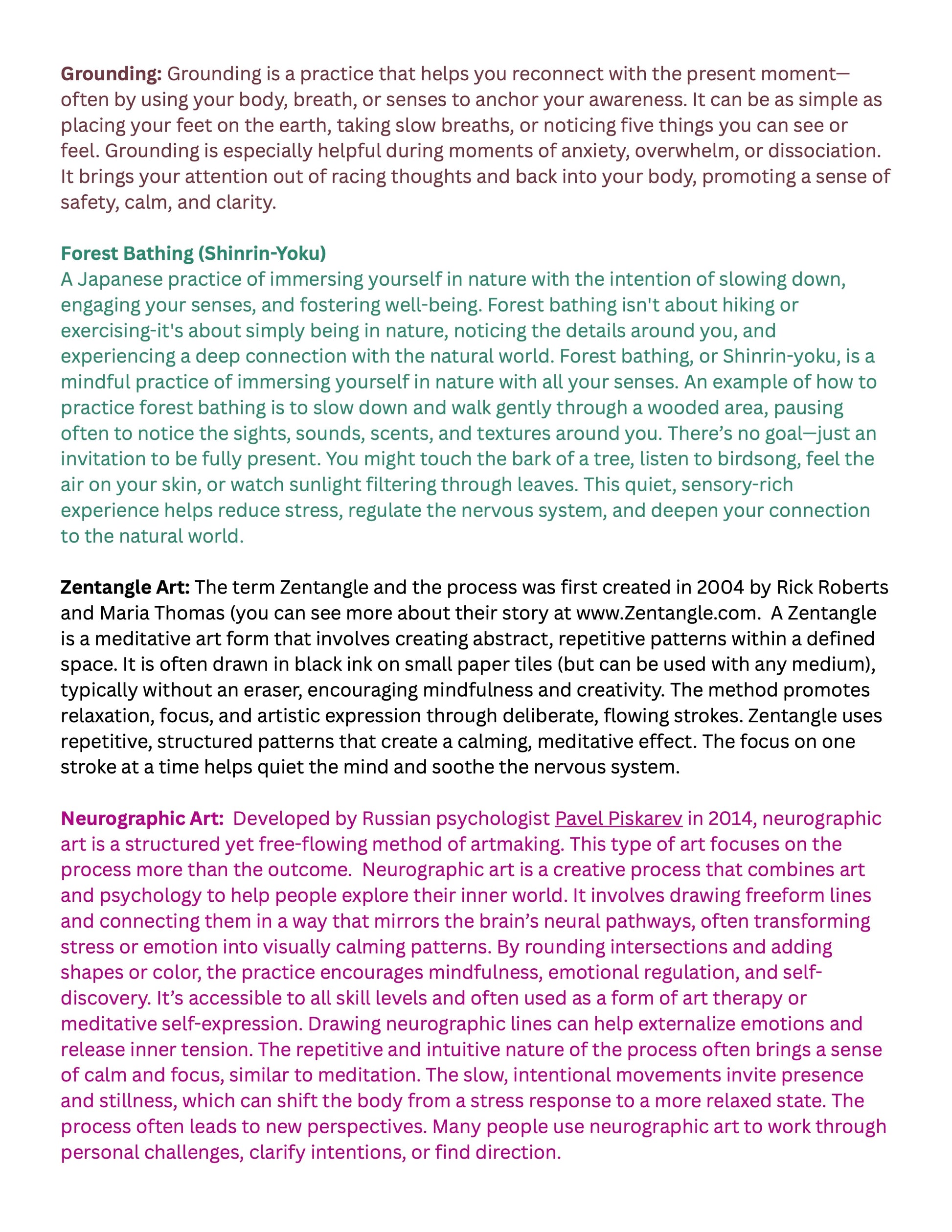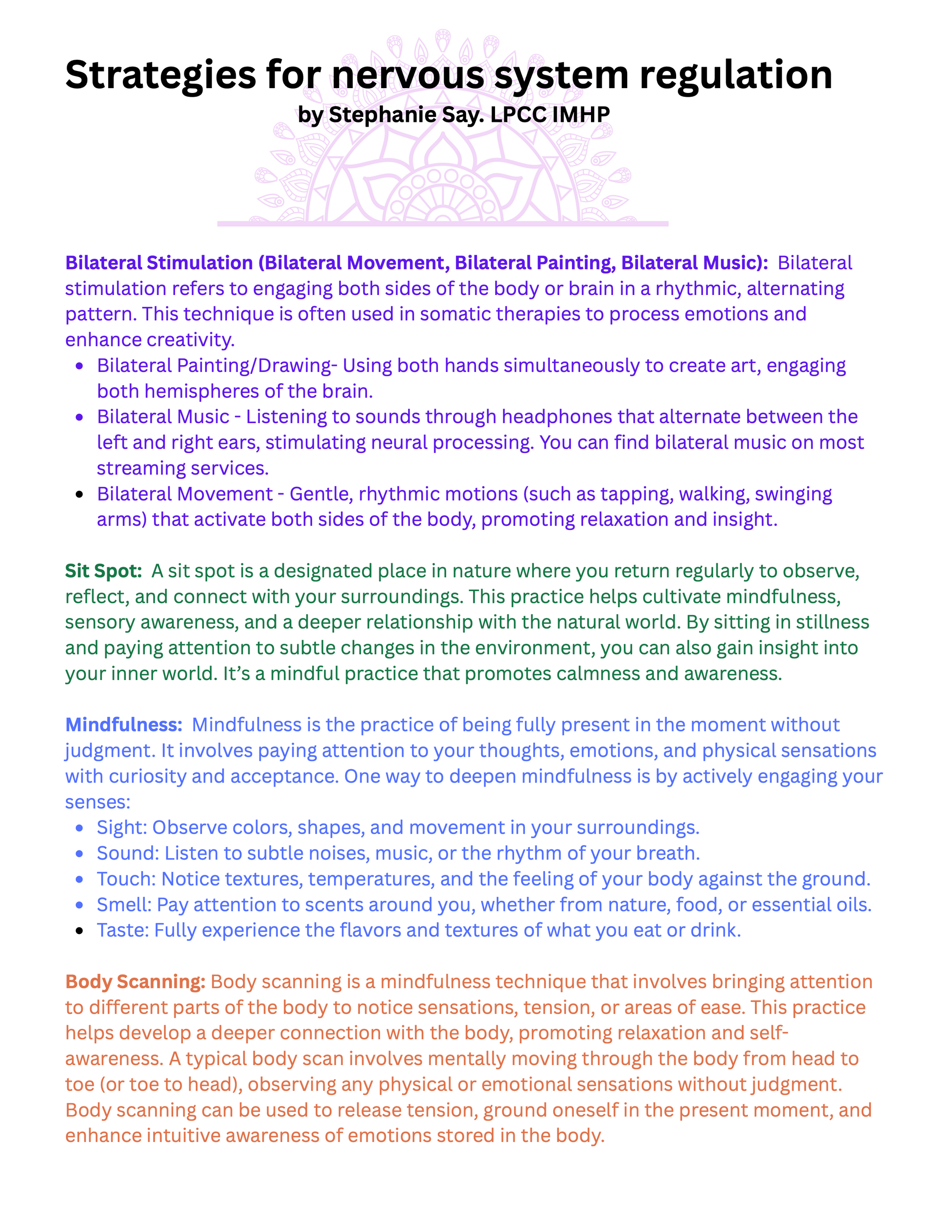 2 page document created by Stephanie Say with nervous system regulation strategies. Techniques and practices from mindfulness, somatic therapies and eco-therapy to help calm your nervous system and lower anxiety.